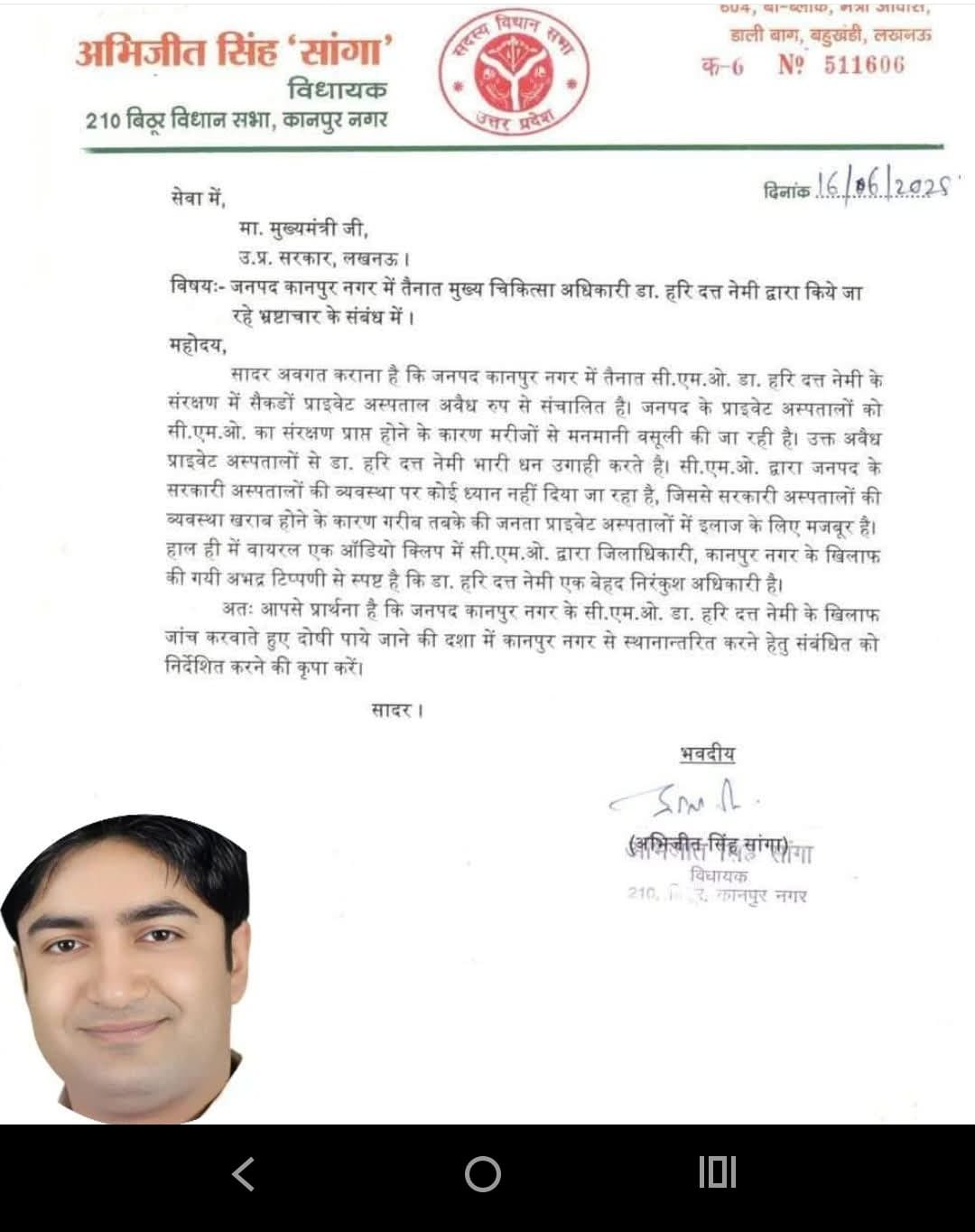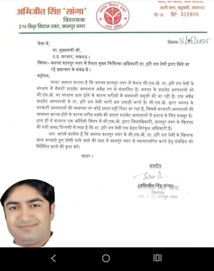 मगर आपतो जिंदा हो,यहां पर बैठे हो। कानपुर डीएम जितेंद्र प्रताप सिंह और सीएमओ डॉ हरी दत्त नेमी के बीच उपजा विवाद गहराता जा रहा है। डीएम ने जहां शासन को सीएमओ को हटाने के लिए पत्र लिखा है । वहीं इस बीच विधानसभा अध्यक्ष सतीश महाना ने डिप्टी सीएम व चिकित्सा स्वास्थ्य मंत्री बृजेश पाठक को पत्र लिखकर सीएमओ को कानपुर में रखने की मांग करी है। इसी के साथ-साथ भाजपा विधायक सुरेंद्र मैथानी ने व एमएलसी अरुण पाठक ने सीएमओ के पक्ष में लेटर लिखकर डिप्टी सीएम व चिकित्सा स्वास्थ्य मंत्री बृजेश पाठक को पत्र भेजा है और सीएमओ को कानपुर में ही रखने की बात कही है। विवादित ऑडियो सामने आने के बाद कानपुर डीएम जितेंद्र प्रताप सिंह और सीएमओ डॉ हरिदत्त नेमी के बीच विवाद गरमाता जा रहा है जिसकी चर्चाएं अब राजनैतिक गलियारों मे अब तेजी से बढ़ती दिख रही है जी हां आपको बता दे की विधानसभा अध्यक्ष सतीश महाना और भाजपा के दो विधायक सीएमओ के पक्ष में है,तो वहीं बिठूर विधानसभा के चर्चित विधायक अभिजीत सिंह सांगा ने सीएमओ को भ्रष्टाचारी बताते हुए सीधे मुख्यमंत्री को पत्र लिख दिया है। इसके अलावा भाजपा विधायक महेश त्रिवेदी ने भी सीएमओ के खिलाफ मुख्यमंत्री को पत्र लिखा है। इससे भाजपा विधायकों में ही दोफाड़ हो गई है।